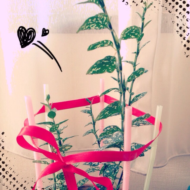 ヒポエステスさんが、冬でも伸びてふにゃ〜んと横になりそうになったので急遽ストローとリボンで支えてみた。