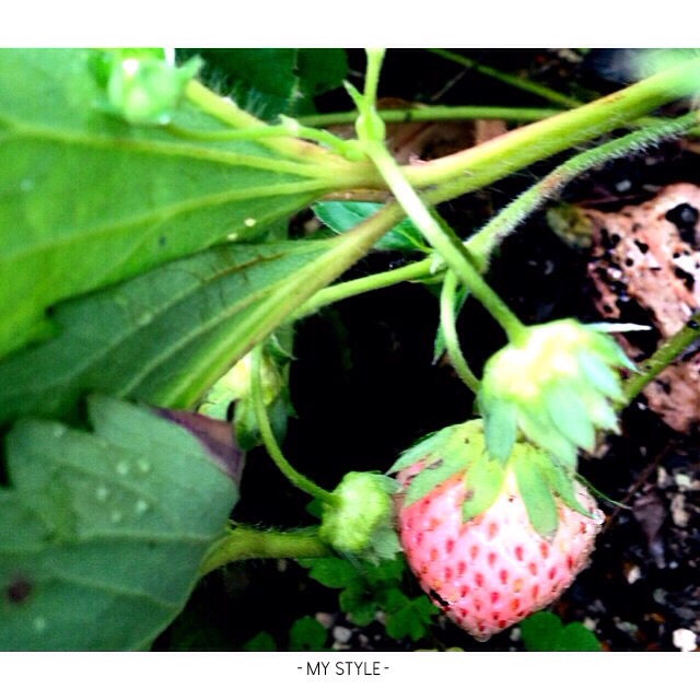 何故か苺の花が咲き、実がなっていた(・_・;
